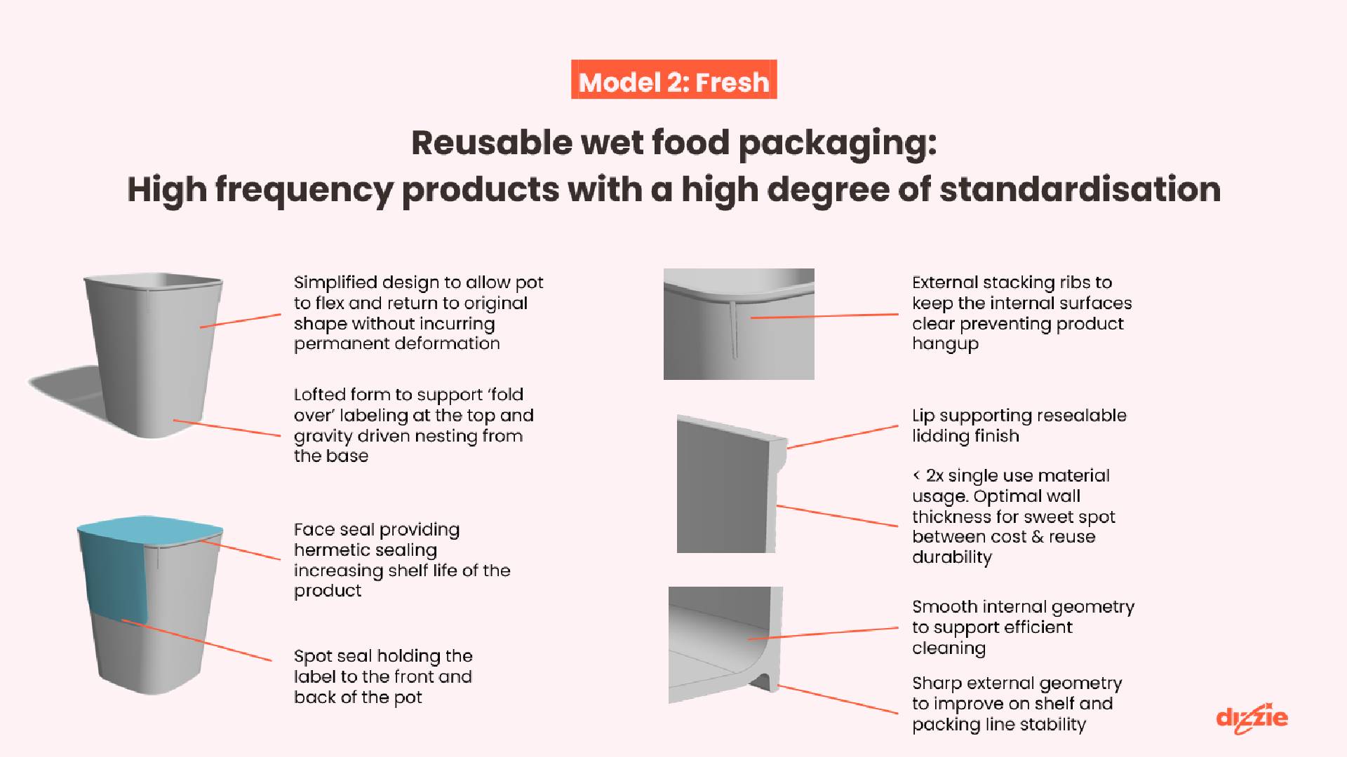 Working with both B&M retail and directly with brands Dizzie identified key SKU’s which are best suited to reuse conversion. Across the deli, dairy, fresh soup and condiments isles we can see liquids served in single use, plastic intensive, pots where pack capacity is synchronous.
