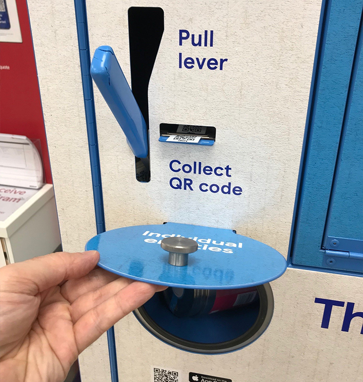 To return your pack, just pull the lever on the outside of the machine to expel a pre-printed QR code sticker. These stickers are digitally printed to achieve a roll of unique ID’s. Once the sticker is applied to your bottle it’s scanned with the app on your phone and placed into the hopper. You are then credited with the returned deposit, I think once the pack has been received from the collection point.